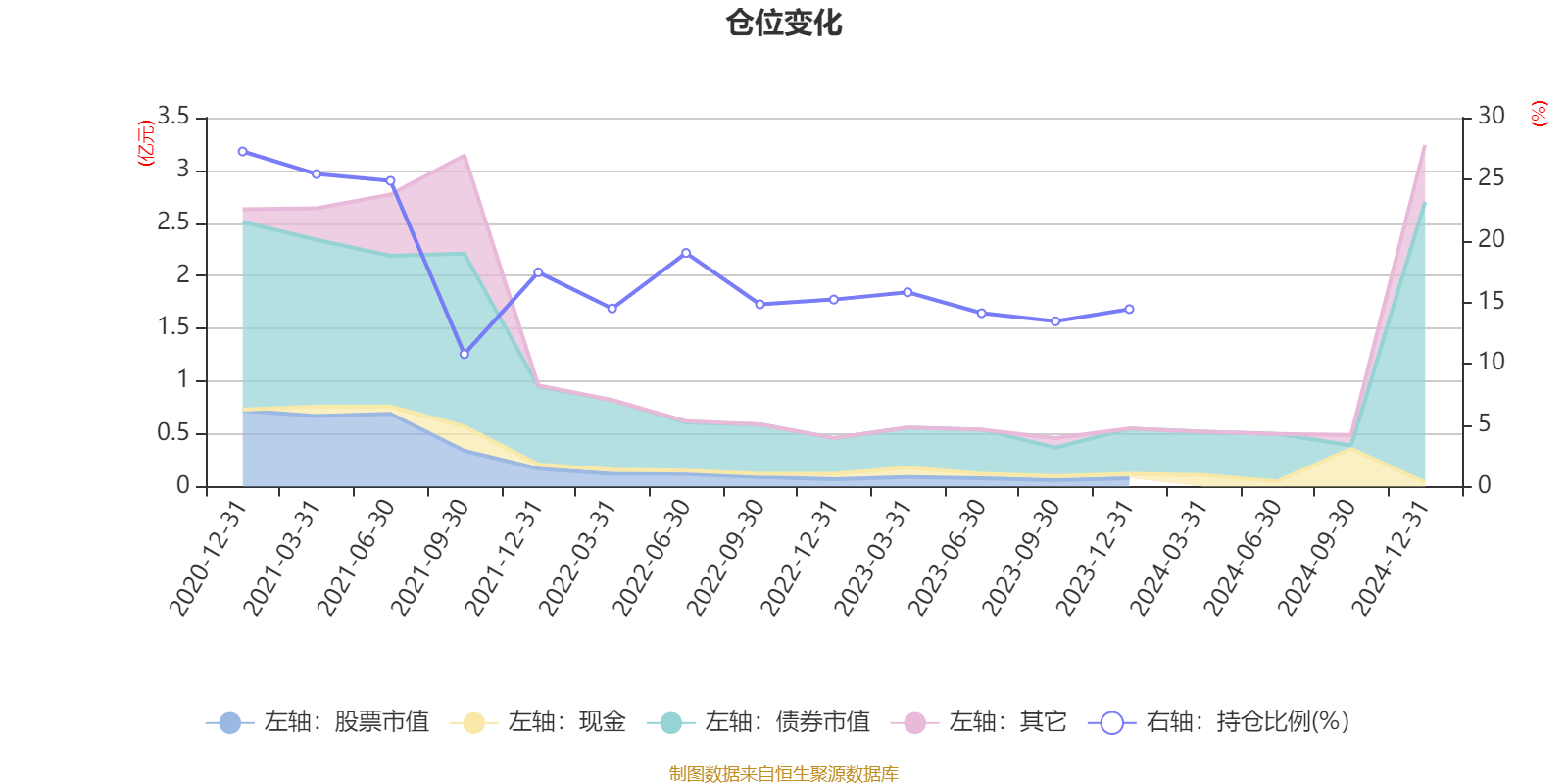 据定期报告数据统计,近三年平均股票仓位为10.11%,同类平均为18.86%。2020年末基金达到27.25%的最高仓位,2021年三季度末最低,为10.77%。